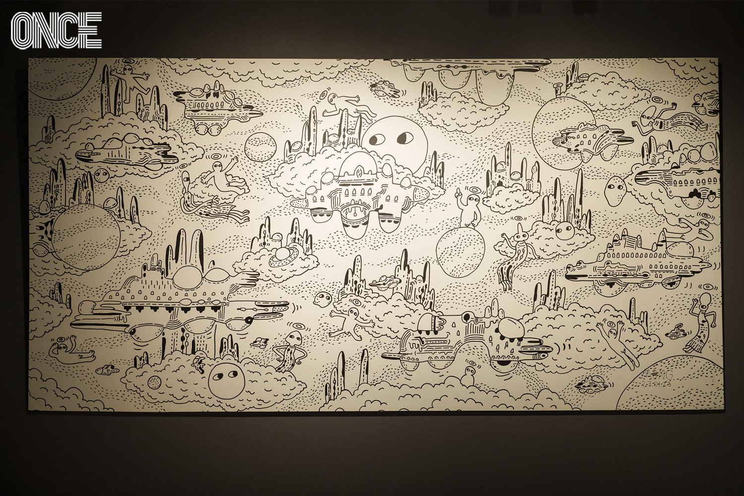 เหมือนอย่างที่มงถ่ายทอดเมืองในอุดมคติของเขาไว้ในภาพวาดขนาดใหญ่ที่ถือได้ว่าเป็นไฮไลต์ของนิทรรศการครั้งนี้ที่บริเวณโซนชั้น 2 เขายืนมองภาพนี้สักพักก่อนจะหันมาพูดกับเราว่า นี่เป็นภาพที่เขาชอบที่สุด “อันนี้เหมือนเป็นเมืองยูโทเปียที่เราสร้างขึ้นมาเอง เอเลี่ยนจะสื่อถึงกลุ่มคนที่สังคมไม่ยอมรับอย่างพวกเรา แต่เราก็มีชีวิตอย่างมีความสุขอยู่ในยูโทเปียของพวกเราได้”