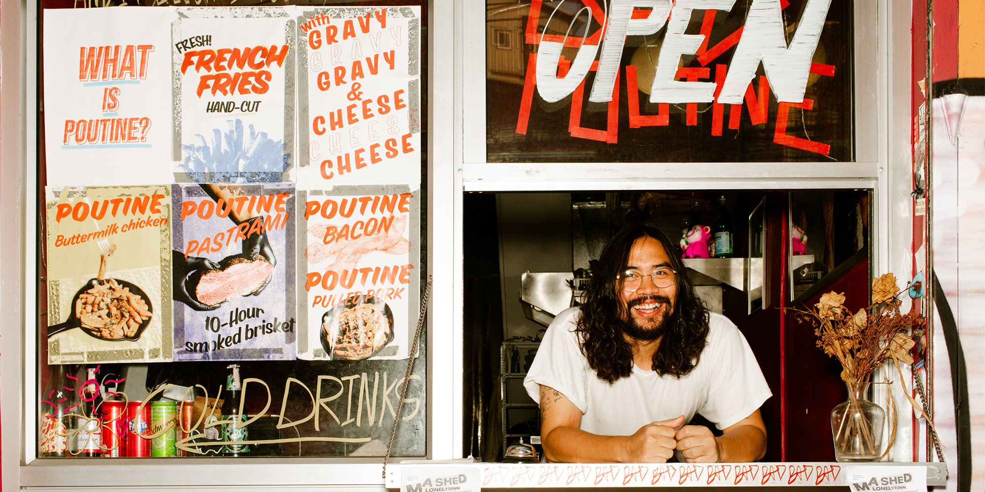 คนอ่านอาจไม่คุ้นตากับคำนี้ คนเขียนเองทีแรกก็ไม่คุ้นชื่อกับอาหารสัญชาติแคนาดาจานนี้เหมือนกัน รู้แค่ว่าร้านที่เราจะไปในวันนี้มีชื่อว่า ‘Bad Poutine’ เดินตาม Google Maps ไปถึงย่านทรงวาด จนเจอเข้ากับหน้าร้านสีแดงที่มีโปสเตอร์มากมายปะติดอยู่เต็มกำแพง