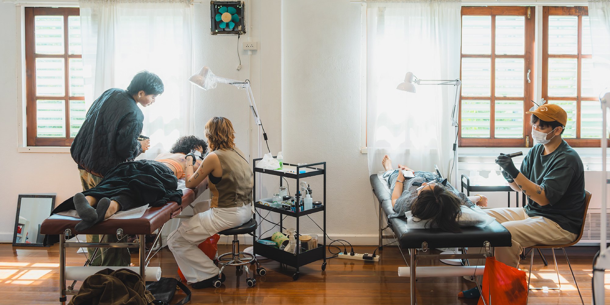 “รอบนี้เราอยากให้เป็นงานสเกลเล็กๆ แต่มีลายที่ใหญ่และละเอียดขึ้น เลยจำกัดให้มีช่างในงานนี้ 6 คน และมีการจองลายทางออนไลน์มาก่อน ซึ่งงานที่แล้วที่ทำกับ Whal & Dolph เราเคยทำแบบแฟลชเดย์ด้วย”