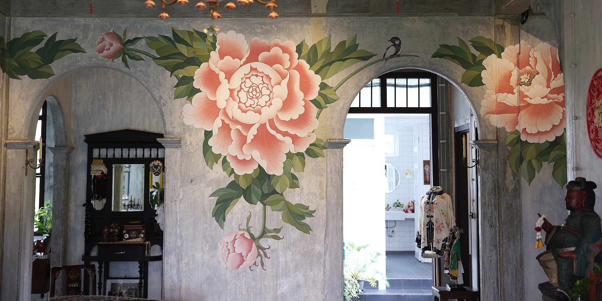 “ในภาพเป็นรูปอาจ้อผู้หญิงเกล้ามวยอยู่ตรงกลาง รอบๆ เป็นหัวใจ 9 ดวงแทนลูกทั้ง 9 คนของอาจ้อ รวมเป็นดอกโบตั๋น สื่อถึงความสุขและมีผู้หญิงเป็นศูนย์กลางความรักของบ้าน ‘Ludalet’ ศิลปินชาวรัสเซียเป็นคนวาด ซึ่งก็เป็นความบังเอิญอีกเรื่อง เพราะตอนเพิ่งเข้ามาภูเก็ตเขาเคยมาที่บ้านหลังนี้แล้วครั้งหนึ่ง แต่เข้าข้างในไม่ได้ เลยอธิษฐานขอให้ได้เข้าบ้านนี้สักครั้ง และได้กลับมาวาดรูปที่นี่อยู่ 3 เดือน”