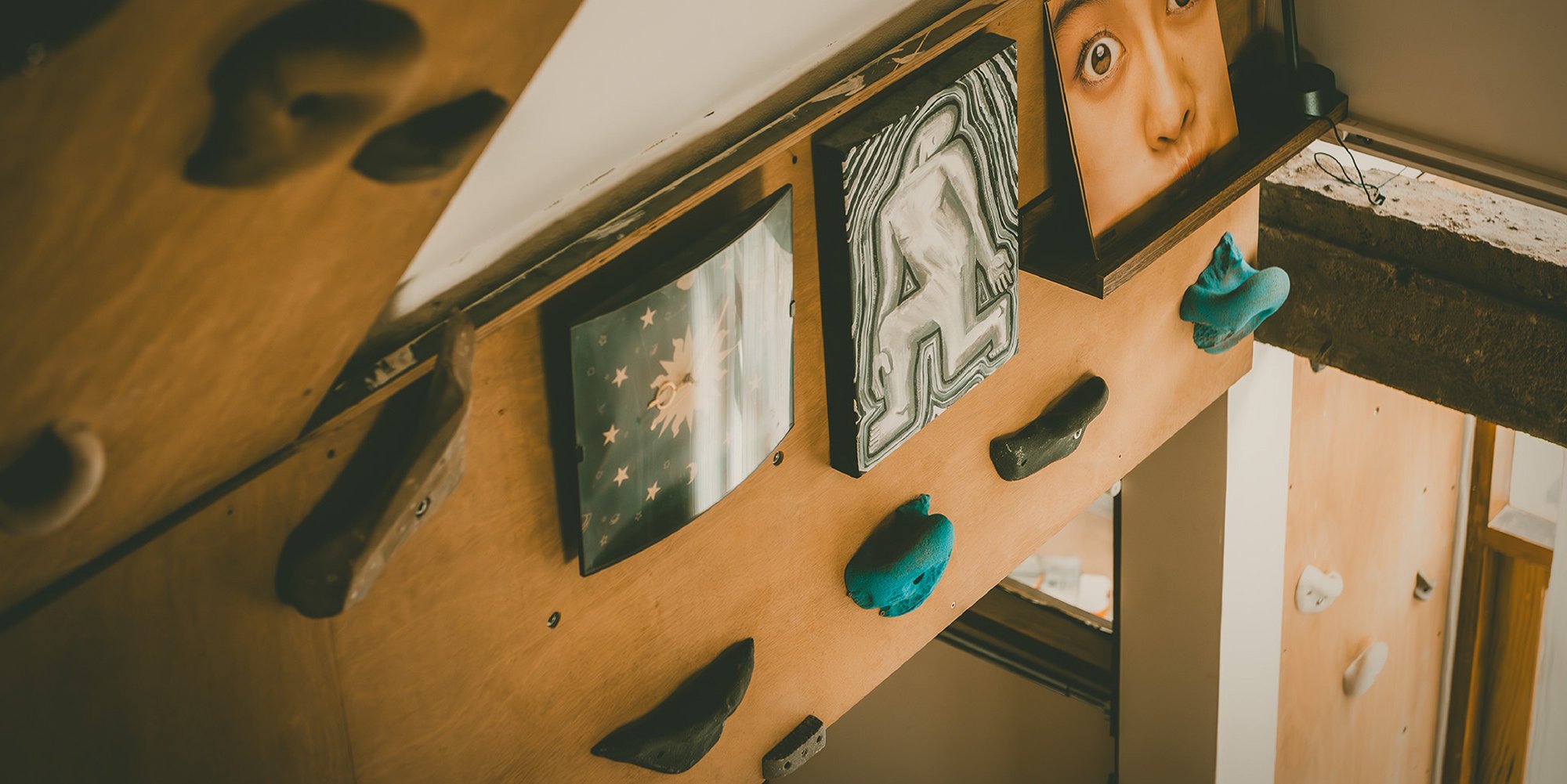 หินผาจำลองถูกขันสกรูติดไว้ตามผนังไม้อัด ตั้งแต่โซฟา ยาวขึ้นไปจนถึงห้องใต้หลังคา ดีนเล่าว่า บางชิ้นเขาก็ไปรับมาจากยิมที่กำลังจะปิดตัวลง จากคนรู้จักที่ชอบทำงาน D.I.Y. ไปจนถึงแบรนด์ไทยที่ทำกันอย่างจริงจังอย่าง VOLA