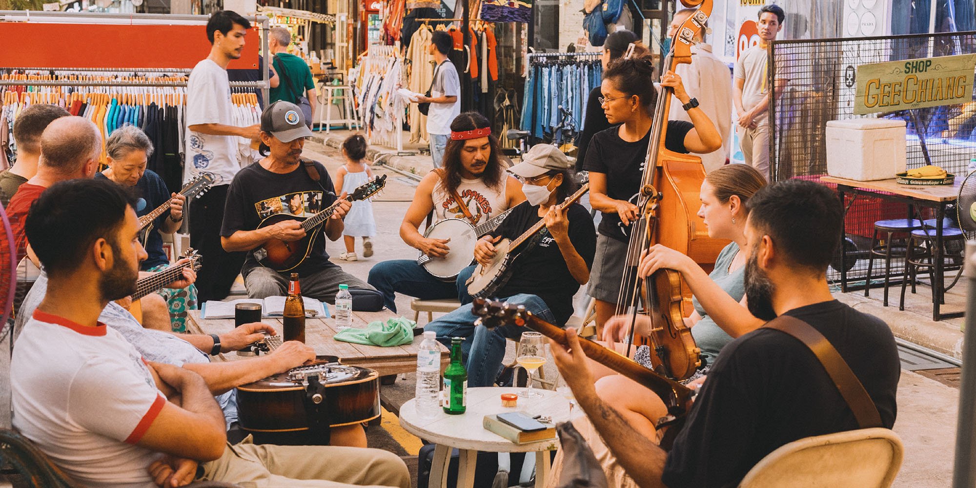 ยิ่งเวลาผ่านไป ผู้เขียนยิ่งเห็นเสน่ห์ของดนตรีบลูแกรสมากขึ้น จากเริ่มต้นประมาณ 5-6 คน จำนวนเพิ่มกลายเป็น 10 คน แต่ละคนถือเครื่องดนตรีของตัวเองมา ไม่ว่าจะเป็น แมนโดลิน แบนโจ หรือกีตาร์โปร่ง วงกลมที่นักดนตรีนั่งล้อมรอบกันเริ่มใหญ่ขึ้น และเมื่อเวลาผ่านไปอีกไม่นาน ผู้เขียนพบว่ามีคนรวมตัวเล่นกันเกือบ 20 คน เพราะมีทั้งน้องๆ เด็กรุ่นใหม่ที่ไม่เคยเล่นมาก่อน อยากมาเรียนรู้กับดนตรีสไตล์ใหม่ (เจ้าตัวบอกว่าปกติเล่นไวโอลิน แต่อยากลองมาเล่นเชลโล หนึ่งในเครื่องดนตรีของแนวเพลงบลูแกรสดูบ้าง) ไปจนถึงหนุ่มต่างชาติที่แค่มาเดินเที่ยว แต่ทันทีที่เขาบอกว่าเป็นนักดนตรีกีตาร์คลาสสิก ทางกลุ่มก็ชวนให้เขานั่งลงบนเก้าอี้ จัดหากีตาร์มาให้ และพาทุกคนเข้าเป็นส่วนหนึ่งของการบรรเลงบทเพลงบลูแกรส