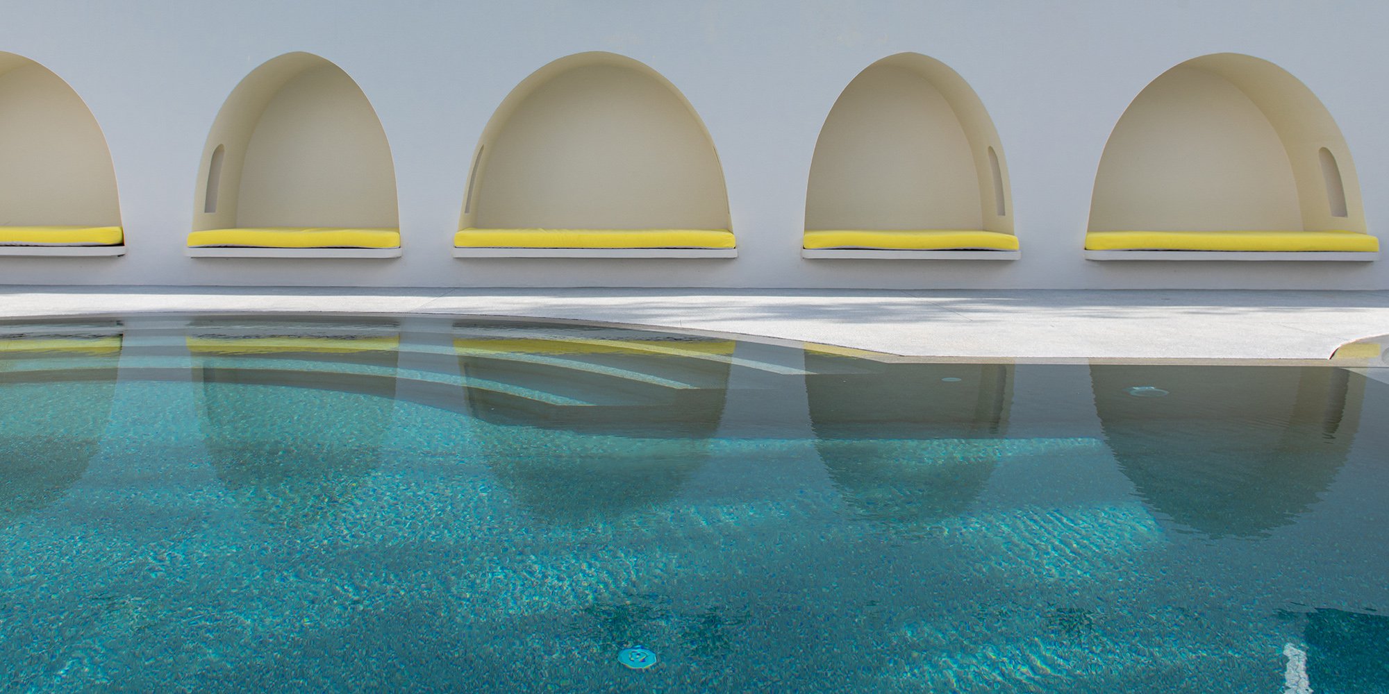 อาคารห้องพักโอบล้อมสระว่ายน้ำที่สวยสะดุดตาเมื่อแรกเห็น ส่วนห้องอาหารแบบออลเดย์ไดนิ่งและเป็นคาเฟ่ด้วยในตัวเดียวกัน ก็มีบรรยากาศโคซี่จากงานเฟอร์นิเจอร์หวายที่เลือกสรรมาแล้วอย่างดี เก๋ไก๋ด้วยการจัดวางเบาะนั่ง หมอนอิงสีเหลืองสดใส ประดับไฟกลมสีขาว