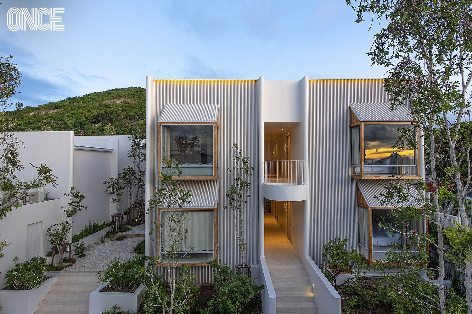ตัวอาคารห้องพักเป็นแบบ low-rise เพื่อไม่ให้บังวิวภูเขาที่เป็นเหมือนฉากหลังของโรงแรม ทุกอาคารอบอุ่นด้วยโทนภายนอกสีขาวที่เข้ากันได้ดีกับงานไม้จากกรอบหน้าต่างกรุกระจกใส เสริมรายละเอียดให้น่าสนใจผ่านลวดลายบนพื้นผิวผนังด้านนอกที่ไปด้วยกันได้ดีกับลายบานประตูทางเข้าห้องพัก