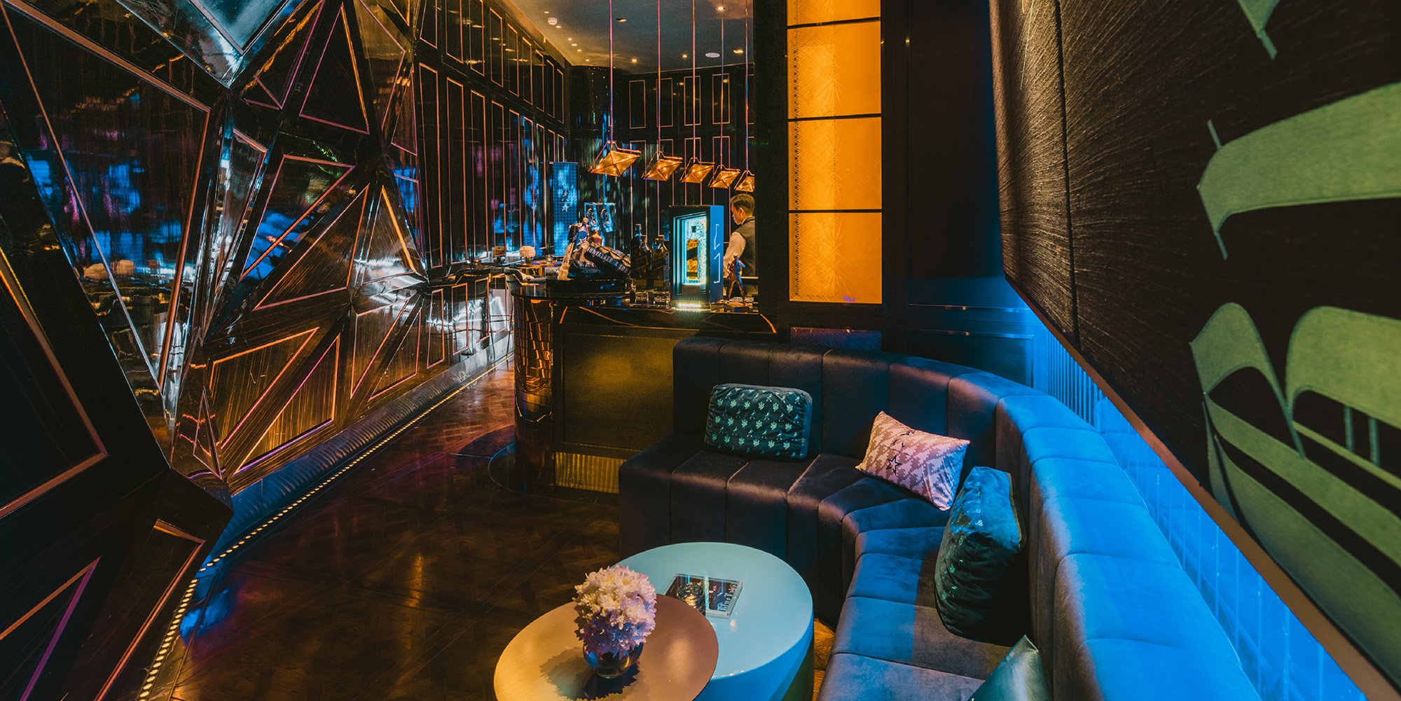 สมชื่อ Johnnie Walker Depth of Blue Room เพราะเมื่อเปิดประตูเข้าไปเราจะได้พบกับบาร์ที่มีความหรูหรา สะดวกสบาย อบอุ่น และที่สำคัญที่สุดคือเต็มไปด้วยแสงสีต่างๆ ภายในร้านที่ถ่ายทอดออกมาผ่านโทนสีเดียว นั่นคือ “Blue”