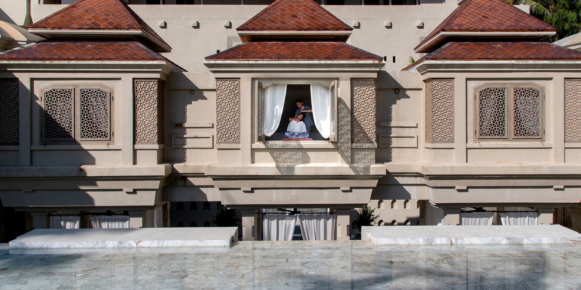“พอเราพบว่าอารยธรรมสมัยนั้นจะมีความผสมผสานอารยธรรมอุษาคเนย์เราก็เลยเริ่มไปเสาะหาของตกแต่งที่เป็นของเก่าโบราณ เราไปไกลหลายประเทศมาก ไปเดินเที่ยวตามหาตามเมืองทะเลทราย ตามร้านขายของเก่า ตาม Junkyard ถ้าเป็นประตูไม้อินเดียโบราณจะเห็นว่าตรงกลางจะมีการแกะสลักเป็นรูปพระพิฆเนศ ทั้งประตูหลัก และประตูหน้าสปา เพราะพระคเณศเป็นสัญลักษณ์แห่งความสำเร็จ เฟอร์นิเจอร์หลายๆ ชิ้นก็เป็นงานโบราณ (Antique) หรืออาจจะถอดชิ้นส่วนไม้แกะสลักมา แล้วเอามาประกอบเป็นเครื่องเรือน อย่างโต๊ะที่เรานั่งอยู่ …อันนี้เป็นของใหม่ครับ” บอนจบเรื่องเล่าด้วยเสียงหัวเราะ