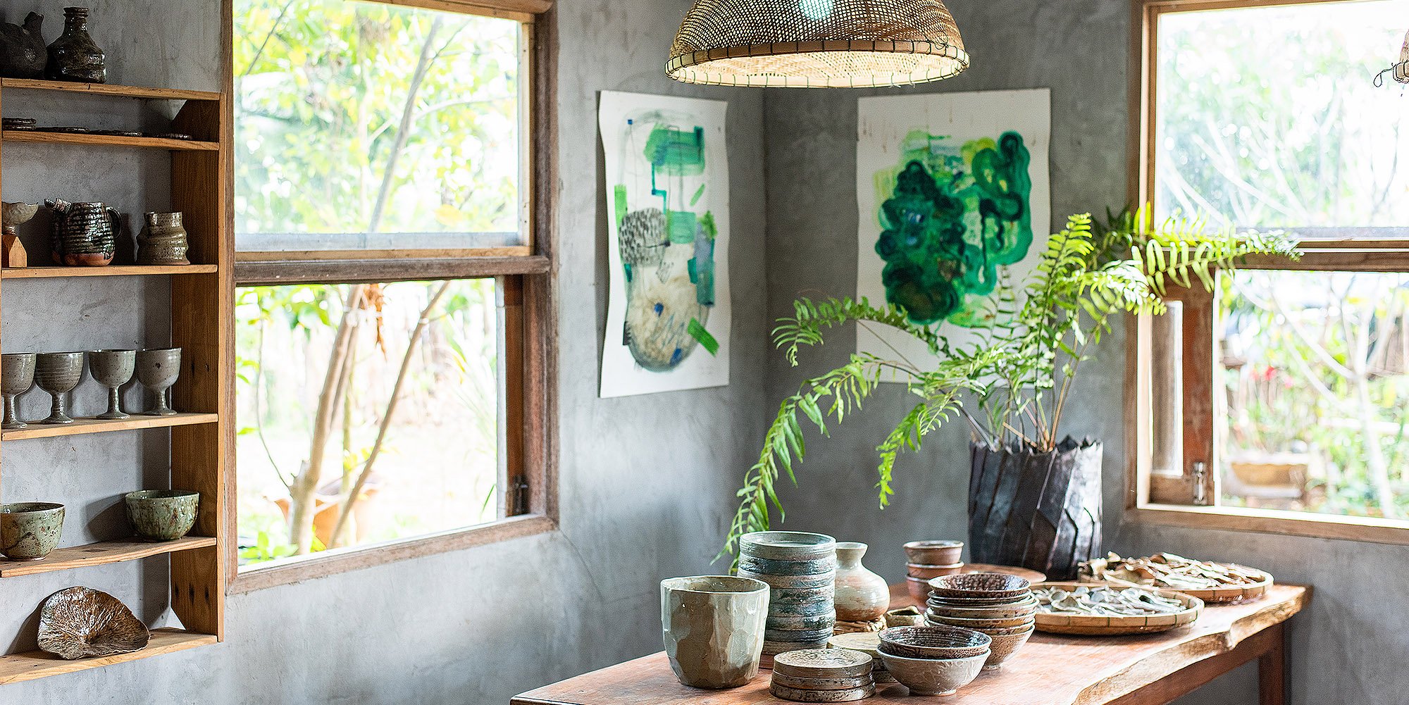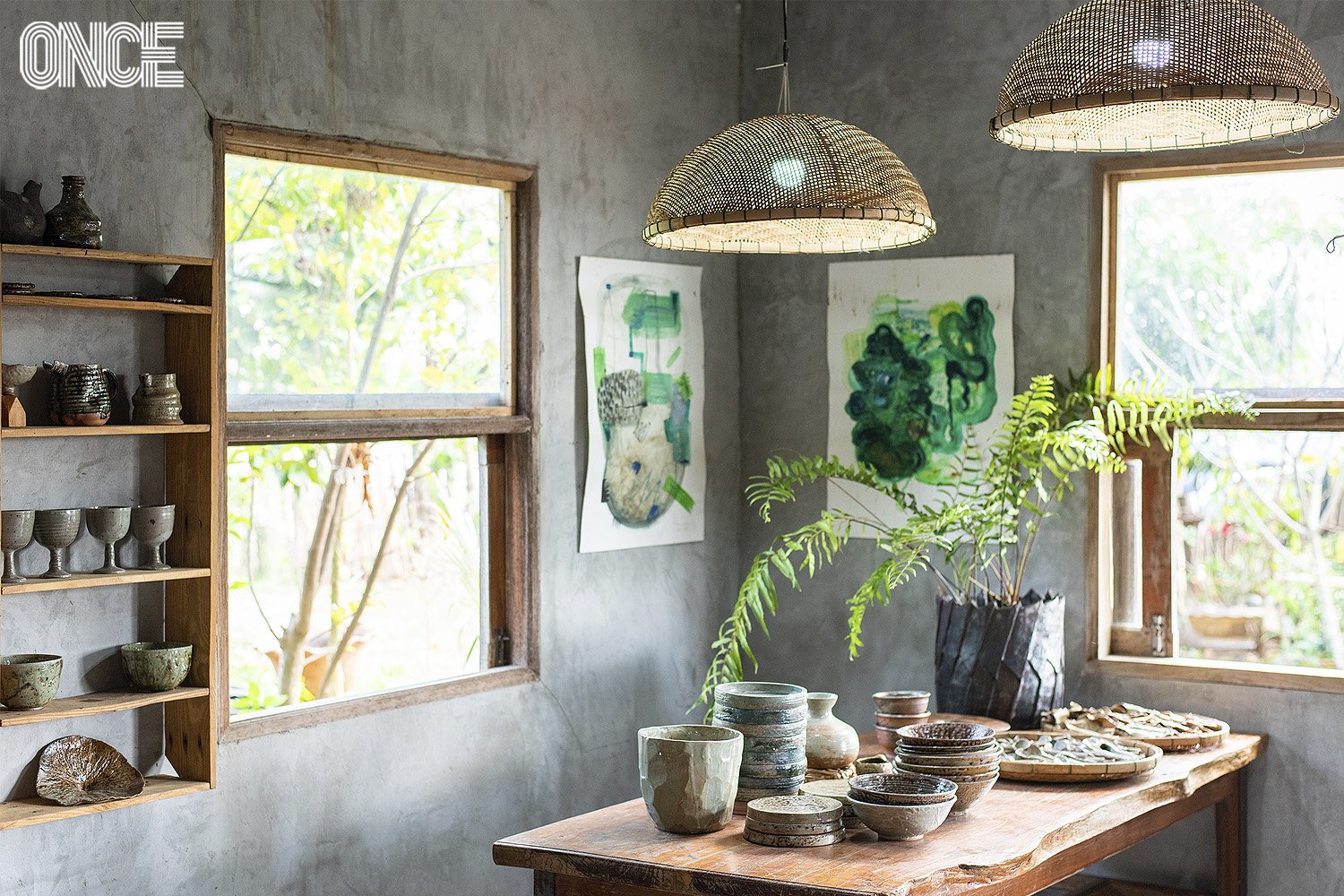 “เราอยากทำเซรามิกที่สื่อสารความเป็นเราจริงๆ พอเราลาออกจากงานกลับมาอยู่บ้าน เราเอาโนฮาวที่ได้เรียนกับอาจารย์มาตีความ ทดลองเรียนรู้ด้วยตัวเองอยู่ตลอด ทั้งเอาดิน ขี้เถ้า สีเคลือบ สีครามที่เขามักเอาไปย้อมผ้าใช่ไหม แต่เราเอามาเคลือบ (หัวเราะ) เราเน้นแหล่งวัตถุดิบที่หาได้จากพื้นที่รอบบ้าน และในหมู่บ้านเราทั้งหมดมาสร้างงาน”