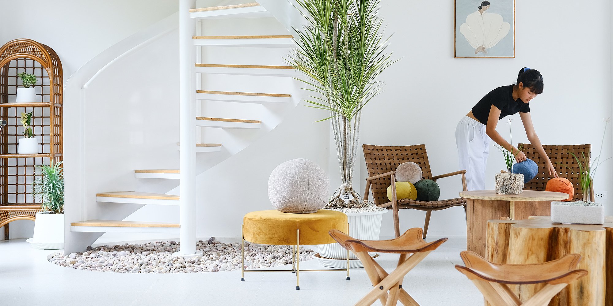 พอถึงล็อบบี้ซึ่งเป็นอาคารชั้นเดียวสีขาวหลังคาสูงโปร่ง การตกแต่งภายในก็ยังคงสวยเตะตา หน่อยพูดกับเราว่าเพราะที่นี่ตั้งอยู่ก่อนถึงอำเภอแกลง ไม่ได้อยู่ในย่านชุมชน ไม่มีวิวทะเล มีแค่วิวเขียวๆ ของสวนทุเรียนและสวนป่าหลังบ้าน การทำให้คนมาพักแล้วรู้สึกประทับใจที่สุดนั้นก็ต้องทำให้เขารู้สึกเพลินที่สุด ความดีเทลจึงบังเกิด และแนนก็คือคนเลือก จัดวางเฟอร์นิเจอร์และของประดับทุกชิ้นด้วยตัวเองซึ่งเป็นความมิกซ์แอนด์แมตช์ที่ดูน่ารัก และแน่นอนว่าถ่ายรูปได้ทุกมุม แม้กระทั่งบันไดวนสีขาว เราเชื่อว่าเป็นอีกมุมหนึ่งที่ทุกคนต้องไม่พลาด