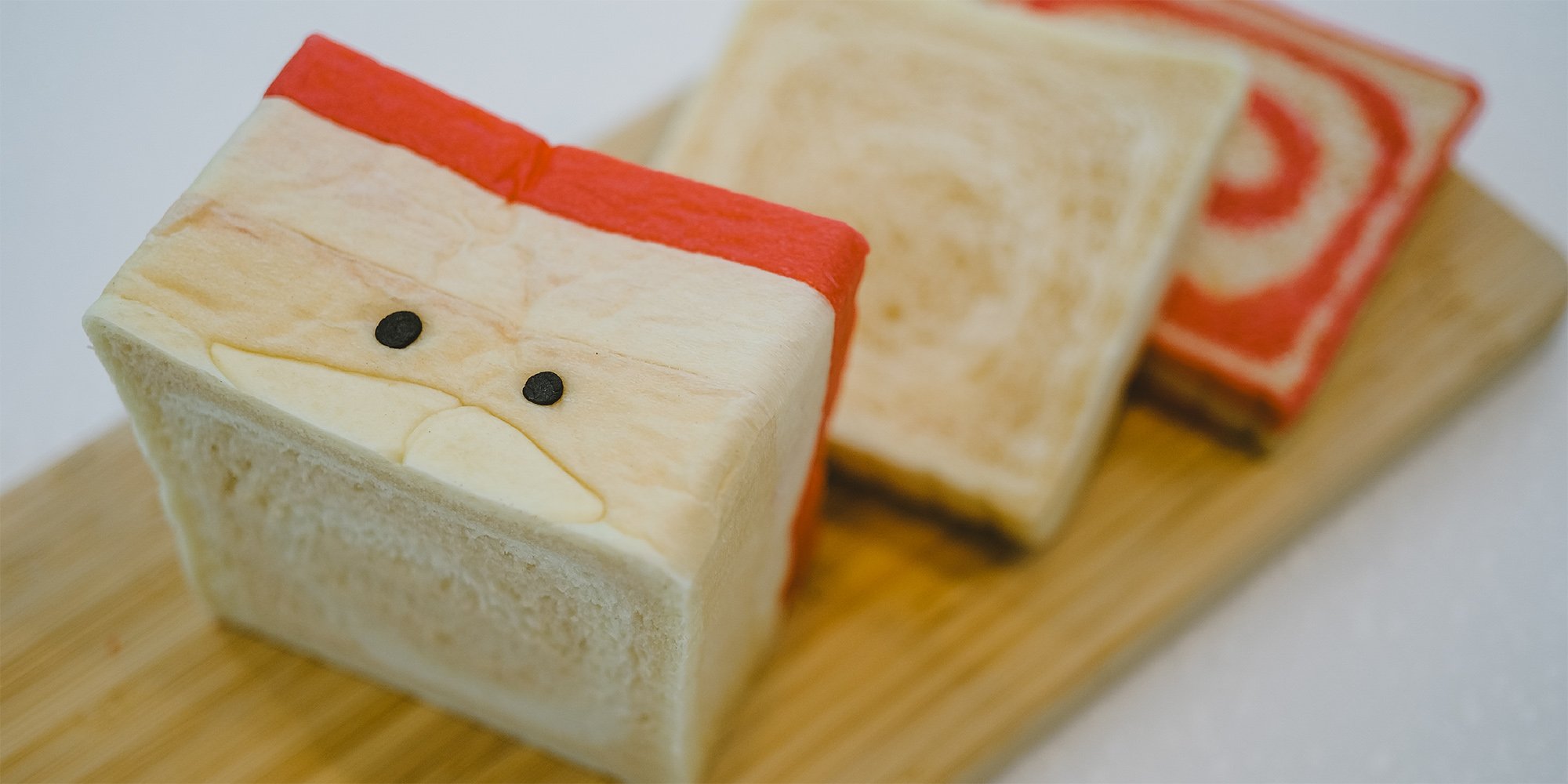 ตัวสุดท้ายคือซานตาคลอสที่ขึ้นรูปยากสุดๆ ใช้ขนมปังแบบโชกุปัง ถ้าสังเกตดีๆ ลายข้างบนกับลายข้างล่างมีสีแตกต่างกัน ผลมาจากการจัดวางและสร้างสรรค์ลายด้านนอกและด้านในให้สอดคล้องกัน รูปร่างคล้ายกระแสน้ำวนเวียน แต่เป็นเวอร์ชันที่มีสีสันสดใส จากนั้นเพิ่มรายละเอียดบางส่วนเข้าไปเพื่อความสมจริง เติมตา ใส่หนวด เพิ่มเครา จนออกมาเป็นซานตาคลอสขวัญใจเด็กๆ ซานตาคลอสจึงเป็นขนมปังที่ดีไซน์โดดเด่นทั้งหน้าตาและการวางแพตเทิร์น