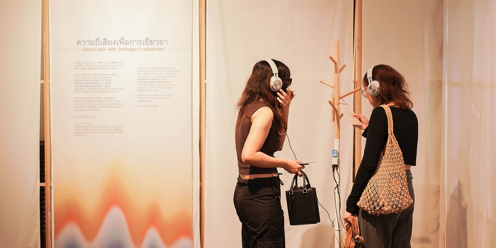 โซนชั้น 1 ออกแบบให้สามารถเดินฟังเสียงตามมุมต่างๆ หรือนั่งโซฟาตัวใหญ่กลางห้องโถงเพื่อรับฟังเสียงโดยรอบ ขณะที่ชั้น 3 คือโซน ASMR สามารถฟังเสียงผ่านหูฟังและเลือกฟังในสิ่งที่ตัวเองรู้สึกผ่อนคลายสบายใจได้มากขึ้น โดยได้ทีมซาวเอนจิเนียจาก ‘Hear and Found’ มาร่วมออกแบบประสบการณ์ในเรื่องเสียงต่างๆ ในครั้งนี้