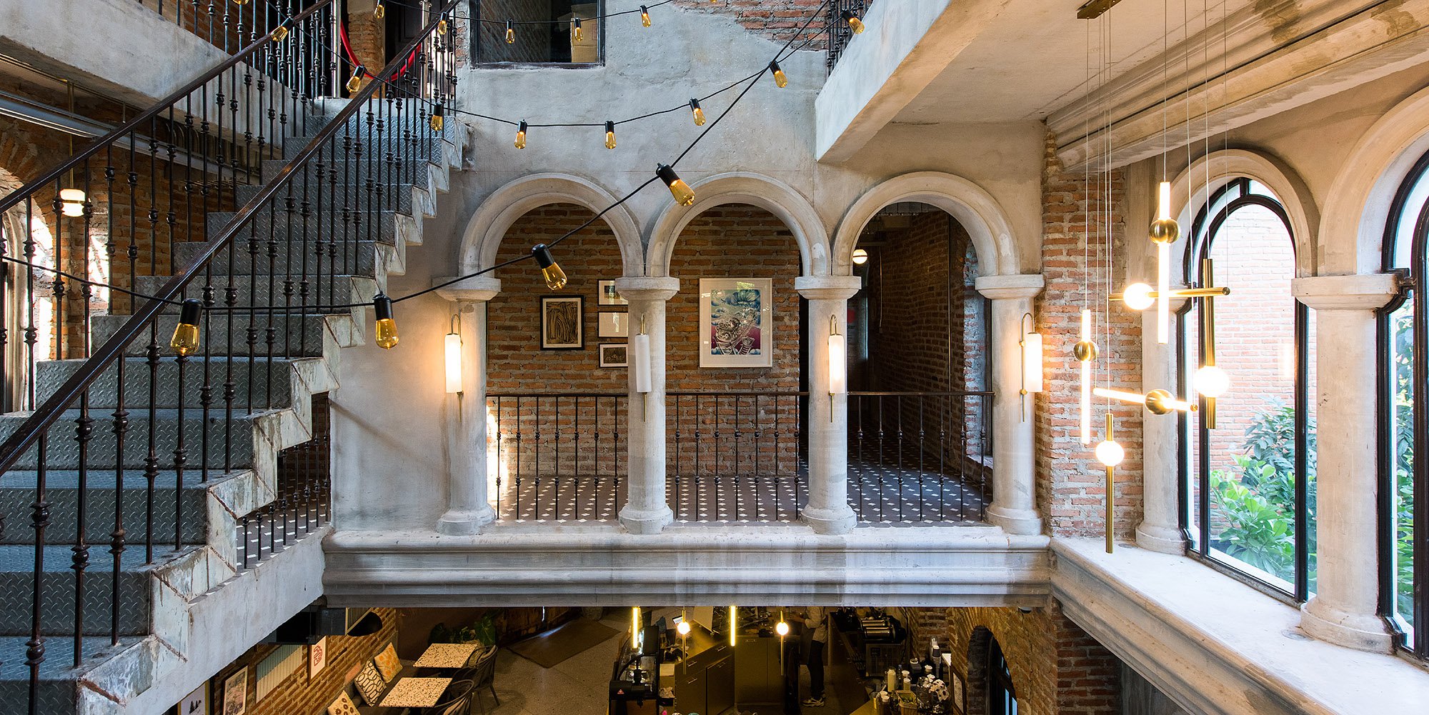 ผนังกำแพงในส่วนที่เป็นปูนเปลือย ตั้งใจแต่งให้ดูเก่า คล้ายกับว่าตึกนี้ผ่านการรีโนเวตมาแล้วหลายยุคหลายสมัย จนเกิดคราบและร่องรอยความหม่นหมองที่เปลี่ยนแปลงไปตามกาลเวลา ต้องอาศัยทั้งความเละ และความตั้งใจทำในบางมุม ช่างก่อสร้างทำงานได้เนี้ยบไร้ที่ติ ทำให้ดูสมจริงมากทีเดียว เอินยังเลือกเพิ่มสีสันด้วยการแขวนภาพวาดศิลปะของศิลปินดังในยุคเรเนสซองส์ รวมถึงการจัดวางรูปปั้นประติมากรรมตามพื้นที่มุมต่างๆ ทำให้รู้สึกได้ถึงกลิ่นอายความเป็นซากปรักหักพังตามสถาปัตยกรรมฝั่งยุโรปที่ดูมีชีวิตชีวา แฝงไปด้วยเสน่ห์อันน่าหลงใหล