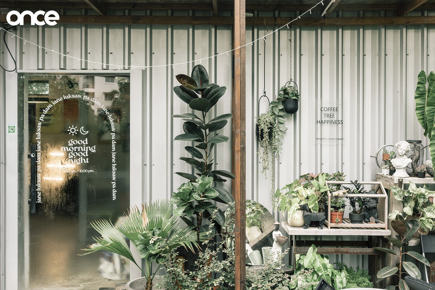 “ด้วยความบังเอิญ เราขับรถผ่านที่ตรงนี้แล้วเห็นต้นไม้ ก็รู้สึกว่า เฮ้ย ชอบต้นไม้ตรงนี้จัง ข้างๆ ก็เป็นป่า มีต้นไม้ใหญ่สองข้างที่เราไม่ได้ไปยุ่งอะไรกับเขาเลย ที่นี่แหละ มันน่าจะสร้างบรรยากาศแบบที่เราต้องการได้ ทำให้ทุกคนสามารถหนีออกจากบ้านมาหลบอยู่ที่บ้านหลังนี้ได้” ตั้มเล่าพร้อมชี้ไปยังต้นไม้ภายในร้าน น่าเสียดายที่เราไปนั่งที่สวนไม่ได้ เนื่องจากฝนที่ตกลงมาแบบไม่มีทีท่าว่าจะหยุดในวันนั้น