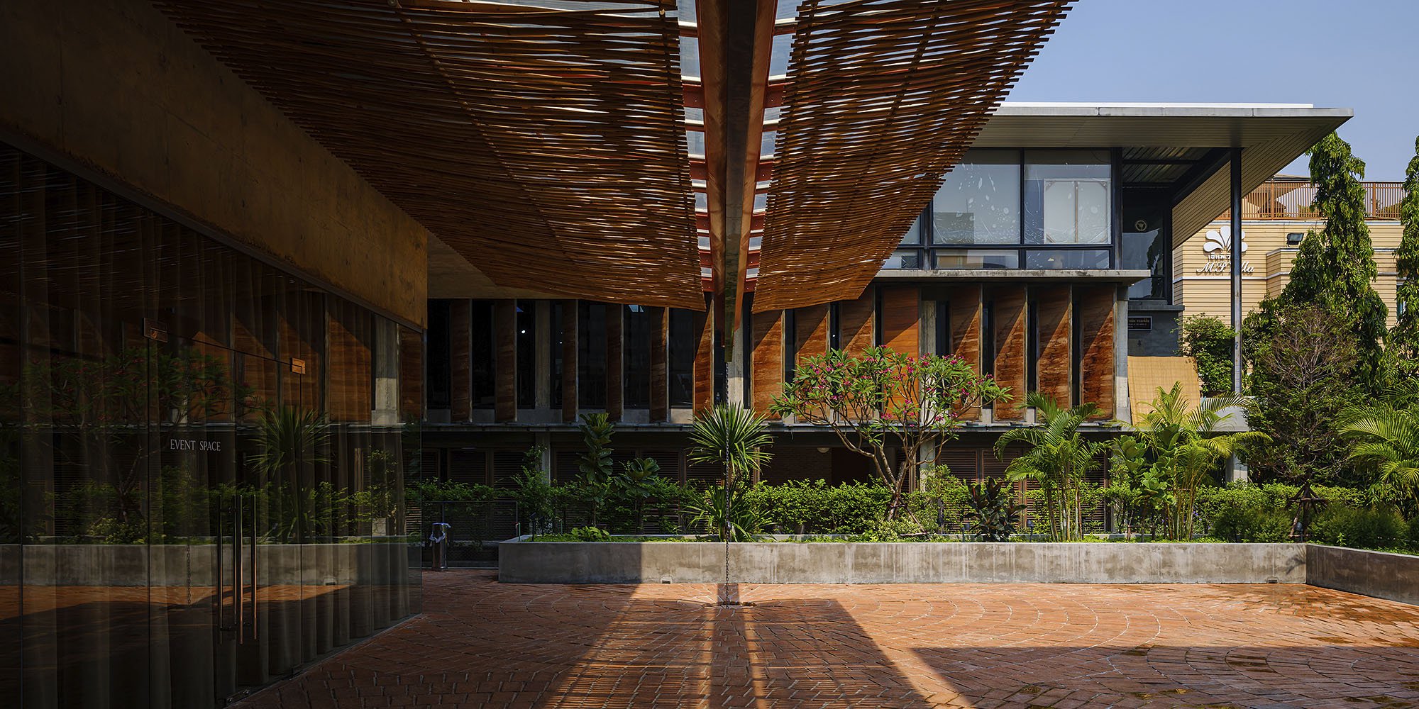 เราพบว่า อาคารมิกซ์ยูส 4 ชั้น 1 รูฟท็อปสไตล์โมเดิร์นแห่งนี้ เป็นเหมือนภาคปัจจุบันของพิพิธภัณฑ์บ้านไทย จิม ทอมป์สัน (Jim Thompson House Museum) ที่อยู่บริเวณใกล้เคียง เพราะในความสมัยใหม่ที่ตาเห็น แต่ให้ความรู้สึกโปร่งโล่งเย็นสบาย ด้วยแนวคิดของสถาปัตยกรรมเขตร้อนชื้น (Tropical Architecture) ที่ปรับจากองค์ประกอบของบ้านจิมฯ มาใส่ไว้ในการออกแบบ