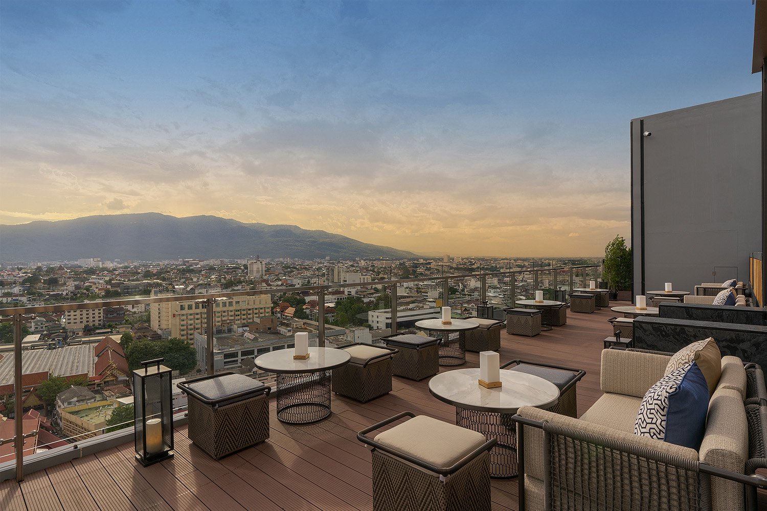 เราขึ้นไปที่ชั้น 22 ที่ตั้งของ ไหม เดอะ สกาย บาร์ (Mai The Sky Bar) ถือเป็นบาร์ที่สูงที่สุดในเชียงใหม่และเรายกให้เป็นไฮไลต์ของที่นี่ เพราะเป็นจุดชมวิวเมืองเชียงใหม่ได้แบบ 360 องศา สามารถชมพระอาทิตย์ตกดินได้สวยงามมากๆ โดยทางโรงแรมจัดที่นั่งเป็น 2 ฝั่ง ฝั่งหนึ่งหันไปทางทิศตะวันออก มองเห็นแม่น้ำปิง ส่วนอีกฝั่งหันไปทางทิศตะวันตกจะมองเห็นพระธาตุดอยสุเทพราชวรวิหารที่ตั้งอยู่บนภูเขา เรามาทันพระอาทิตย์ตกพอดี อากาศเย็นกำลังสบาย เรียกรอยยิ้มบนใบหน้าเราไปไม่น้อย จนต้องรีบหยิบโทรศัพท์ขึ้นมาถ่ายภาพสวยๆ เก็บไว้เป็นความทรงจำเลยล่ะ