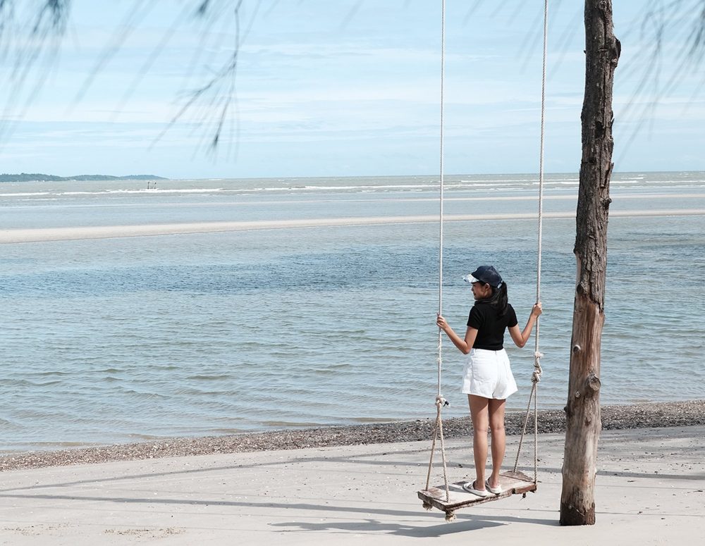 จะเรียกว่าเป็นหาดลับสำหรับคนแปลกหน้าก็คงไม่ผิด หลายคนไปมาแล้วชอบมาก ขับรถเลาะๆ ไปตามเส้นทางวกไปวนมานิดหน่อย จนในที่สุดก็มาถึง ที่นี่เป็นพื้นที่สาธารณะอยู่ในพื้นที่เทศบาลตำบลสุนทรภู่ พัฒนาโดยเทศบาลตำบลสุนทรภู่ร่วมกับผู้นำท้องที่ ปกครองตำบลกร่ำ และชาวบ้านตำบลกร่ำไม่มีอะไรต้อนรับมากไปกว่า แสงแดดและสายลมแห่งธรรมชาติ มันเป็นมุมพิเศษจริงๆ นะ ลมอ่อนๆ พัดโบกทิวสนก็ค่อยๆ ลิ่วไปตามลม ชิงช้าไซส์บิ๊ก ตั้งอยู่เป็นแลนด์มาร์กของหาด ชวนเข้าไปนั่งโยกไกวแบบลืมอายุ มีคนบอกว่าไปตอนช่วงน้ำขึ้นและตะวันกำลังคล้อยตกทะเล โรแมนติกเริ่ดสะแมนแตนไปเลย