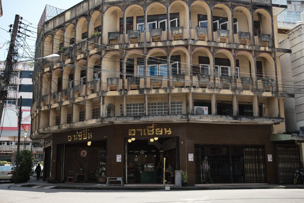 ณ ใจกลางตลาดสดเมืองตรังอันคึกคักจอแจในยามเช้าจะพบร้านกาแฟเล็กๆ ที่กลมกลืนเข้ากับบรรยากาศได้เป็นอย่างดี โดดเด่นด้วยเอกลักษณ์ของตัวอาคารเก่าที่ยังคงโครงสร้างห้างขายเสื้อผ้าในอดีต นั่นคือ อาเชี่ยน คาเฟ่ ที่ตั้งชื่อร้านตามชื่อเดิมของห้าง ภายในร้านตกแต่งเรียบง่ายด้วยเฟอร์นิเจอร์ไม้เก่าเป็นหลัก ฟีลวินเทจ ยิ่งบวกกับความสวยคลาสสิกของตัวตึก ดูรวมๆ แล้วยิ่งมีเสน่ห์เหลือเกิน