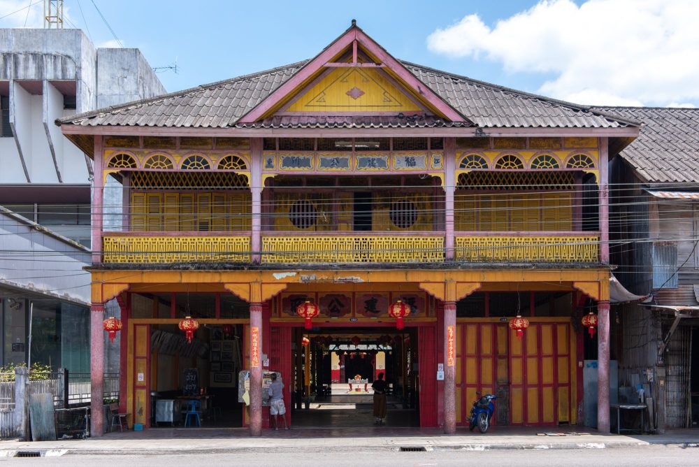 อาคารไม้โบราณสีเหลือง 2 ชั้นขนาด 3 คูหาโดดเด่นอยู่บนถนนรัษฎาในกันตัง คือศาลเจ้าฮกเกี้ยนก๋งก้วน-ม่าจ้อโป๋กันตัง ศาลเจ้าเก่าแก่ที่เป็นศูนย์รวมจิตใจของชาวจีนฮกเกี้ยนที่อพยพมาขึ้นท่าเรือกันตังเพื่อตั้งถิ่นฐานและค้าขายตั้งแต่สมัย ร. 5 นับถึงปัจจุบันมีอายุกว่า 120 ปีแล้ว ถือเป็นจุดเริ่มต้นของการถือศีลกินผักในจังหวัดตรัง อีกทั้งยังเคยเป็นที่ทำการแห่งแรกของโรงเรียนจีน สมาคมจีนโพ้นทะเลแห่งแรกในตรัง