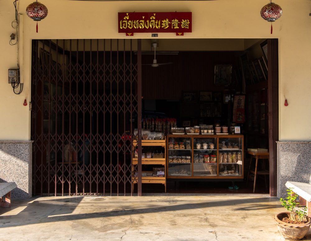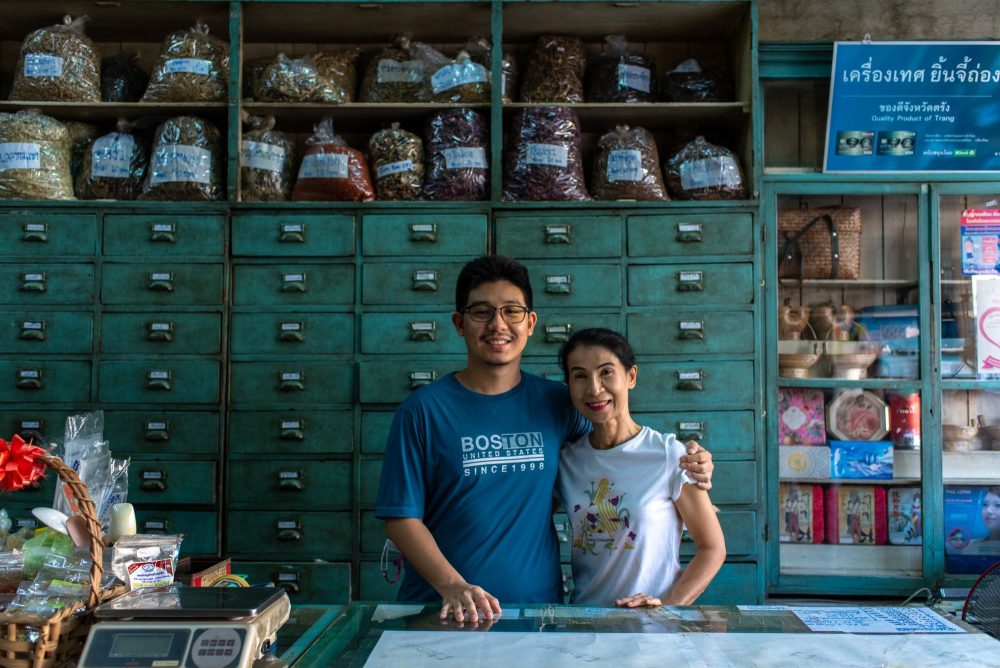 ร้านขายยา เครื่องปรุง เครื่องเทศหมูย่าง ผู้อยู่เบื้องหลังความอร่อยของเมืองตรังในฐานะผู้ผลิตผงหมูย่างเจ้าแรกที่สืบทอดมากกว่า 100 ปี และอีกหลายเมนูประจำถิ่นที่ต้องใช้เครื่องเทศผสมเสร็จของ ยิ้นจี้ถ่อง สูตรพิเศษจากบรรพบุรุษที่สืบทอดกันมากว่า 4 รุ่น แรกเริ่มเดิมทีเป็นแค่ร้านขายยา ต่อมาต้องการมีอาชีพเสริม บวกกับต้นตระกูลเคยเป็นพ่อครัว หรือจุ่มโพ เลยนำวัตถุดิบที่มีมาทำเป็นเครื่องเทศปรุงอาหารจนลูกค้าติดอกติดใจมาต่อเนื่อง และดังไกลไปถึงต่างประเทศที่สั่งเข้ามามากมาย ทั้งสิงคโปร์ มาเลเซีย ฮ่องกง รวมทั้งยุโรปและอเมริกา