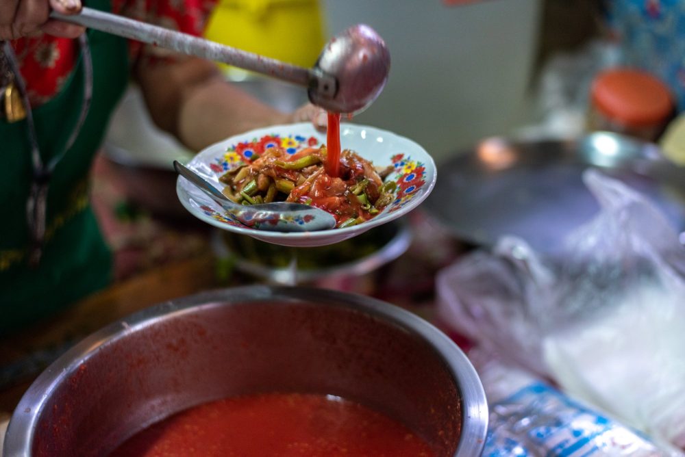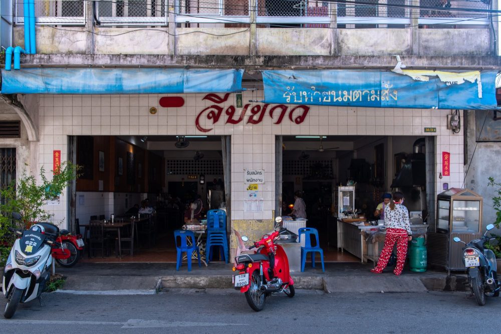 ตรังเป็นเมืองที่ขึ้นชื่อเรื่องมีแต่ของอร่อย แต่ถ้าอยากสัมผัสวิถียามเช้าต้องไม่พลาดร้านดั้งเดิมร้านนี้ จีบขาวเป็นร้านอาหารเช้าเก่าแก่มากว่า 80 ปี ที่ทำเองทุกอย่างวันต่อวัน นอกจากจีบขาว ที่หน้าตาคล้ายฮะเก๋าแต่ข้างในเป็นไส้หมูสับ กินคู่กับน้ำจิ้มติ่มซำสูตรเฉพาะของเมืองตรังที่ไม่ควรพลาดแล้ว ปาท่องโก๋ ที่ไม่ใช่แป้งทอดสีน้ำตาลที่เราคุ้นเคย แต่เป็นขนมแป้งนึ่งสีขาวฟูๆ แท่งสี่เหลี่ยมมีรูพรุน ก็เป็นเมนูขึ้นชื่อของที่นี่ และมักจะไม่เหลือถึงลูกค้าที่มาช้า