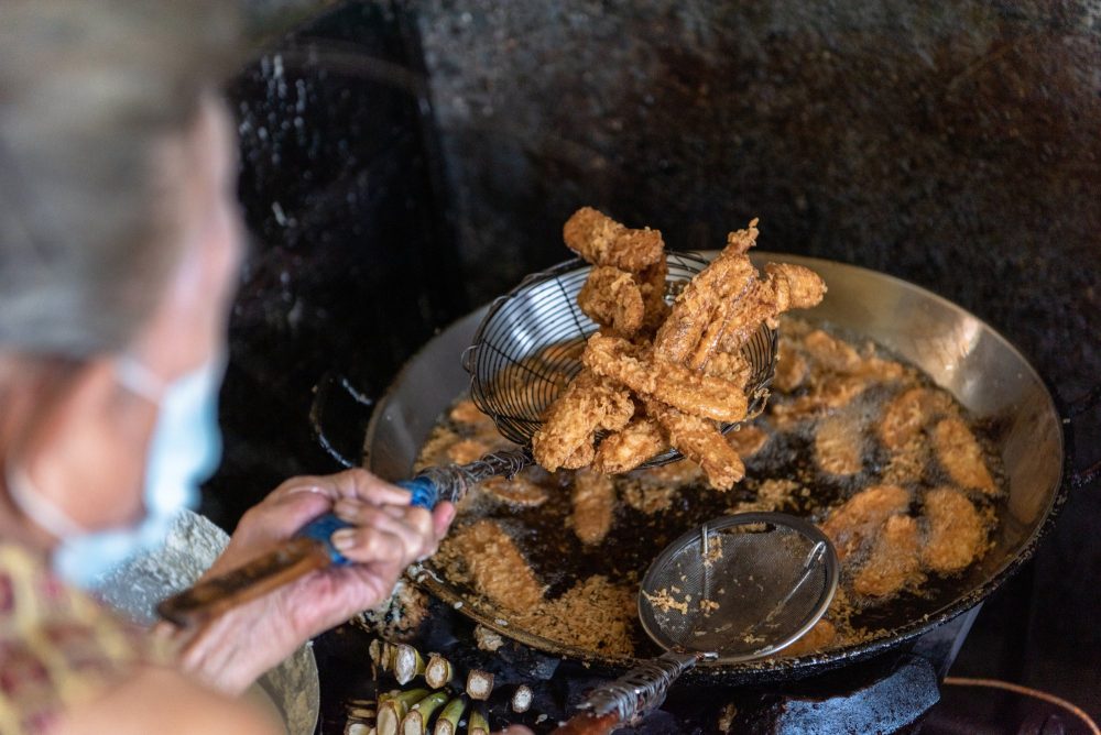 ร้านกล้วยทอดเจ้าดังในตรอกเล็กๆ บนถนนพระราม 6 ของคุณยายผันในวัยเกือบ 90 ปี ที่ยังคงนั่งทอดด้วยตัวเอง ยืนหนึ่งในใจชาวตรังมายาวนานมากกว่า 60 ปี การันตีความอร่อยด้วยการขายดีแบบเทน้ำเทท่า เปิดร้านช่วงเที่ยงแต่บ่ายๆ ก็หมดเกลี้ยงแล้ว นอกจากกล้วยทอดแล้ว ลอดช่องของที่นี่ก็ขึ้นชื่อไม่แพ้กัน เส้นเหนียวนุ่ม น้ำกะทิหวานมันกำลังดีจนหลายคนติดใจ