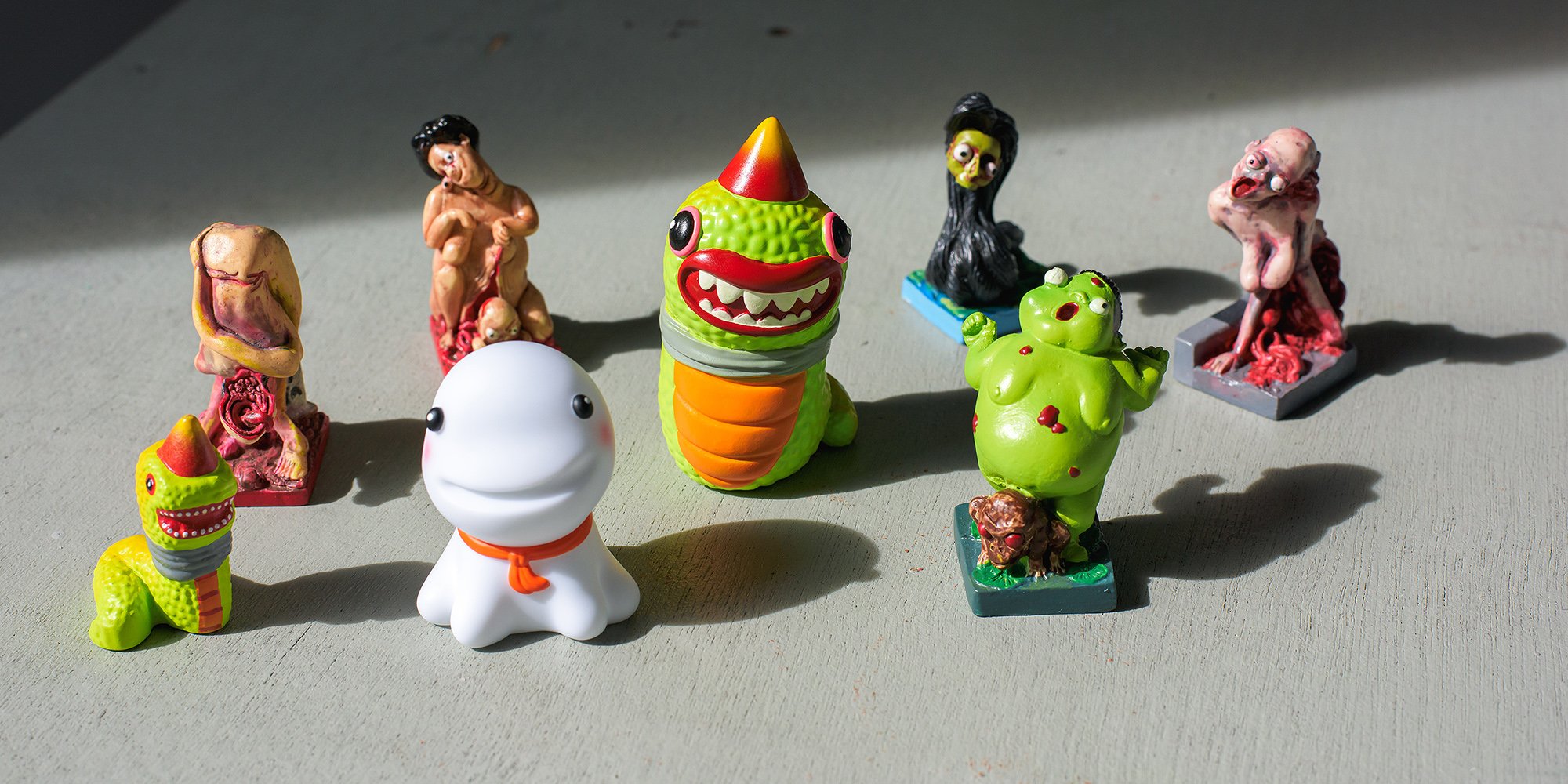 หรือกาชาปองผีที่มาจากตำนานผีไทยอย่างคุณยายสปีดหรือผีพราย แล้วเทคนิคงานนี้สนองแพสชั่นล้วนๆ เพราะอาร์ตทอยทั่วไปเป็นงาน 3D ที่เกิดจากเทคนิค Mirror ให้งานสมมาตร แต่ผมมองว่า ความสมมาตรไม่ใช่มนุษย์ ทีนี้ปั้นๆ อยู่ผมจับบิดเลย ให้มันเบี้ยวนิดเบี้ยวหน่อย อยากให้ร่างกายมีกระดูก