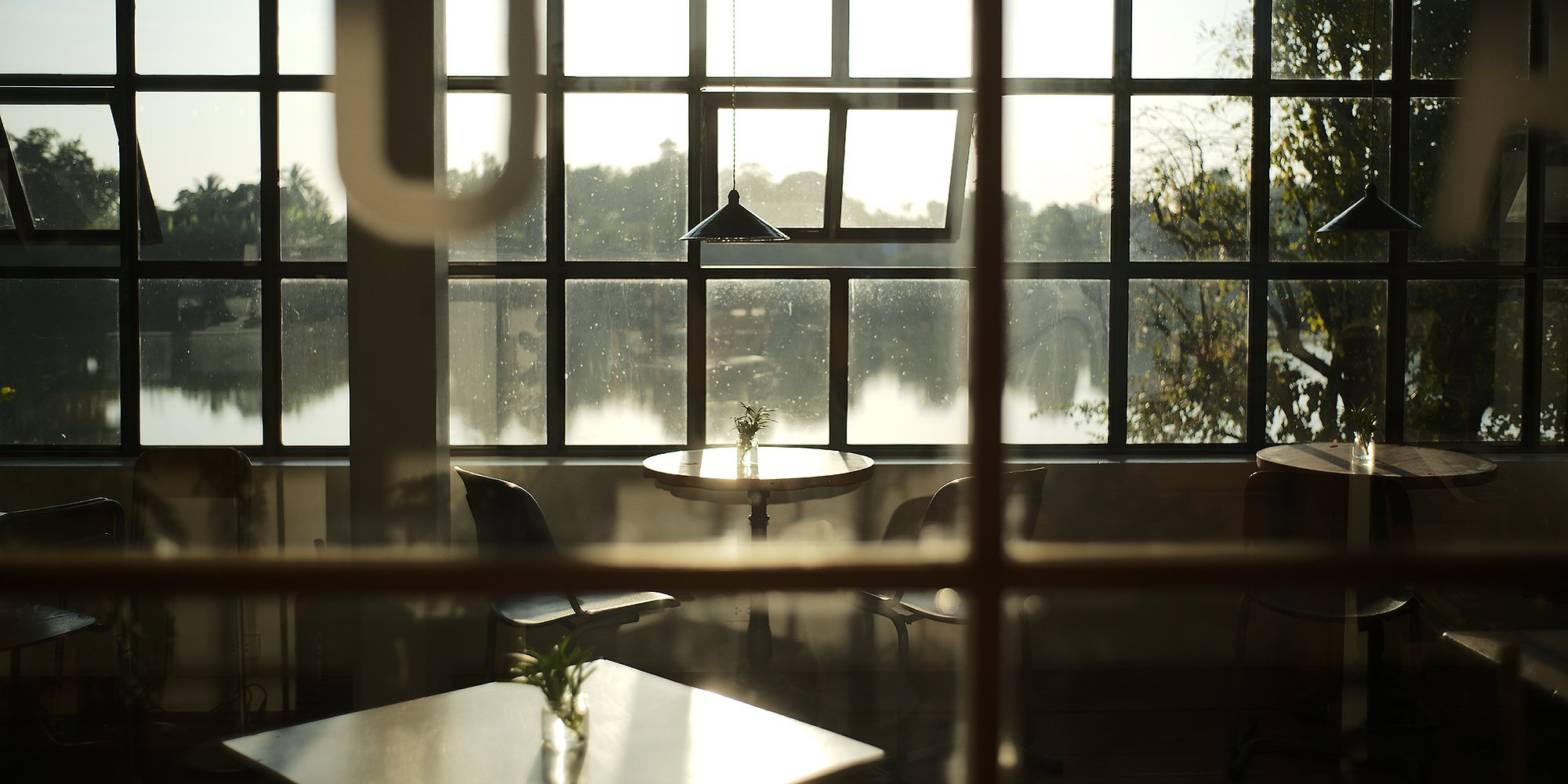 บานกระจกขนาดใหญ่ของคาเฟ่เปิดให้เห็นวิวริมน้ำแม่กลองเต็มตา ยิ่งมีเสน่ห์มากๆ เวลาแสงแดดอ่อนตอนเช้าลอดผ่านเข้ามาสอดรับกับโต๊ะกลมตัวเล็กๆ ริมหน้าต่าง โคมแขวนเพดานแก้วทรงกลมพอเรียงต่อๆ กันก็ไปได้ดีกับงานไม้และเติมเต็มให้มู้ดภายในนั้นดูอบอุ่น
