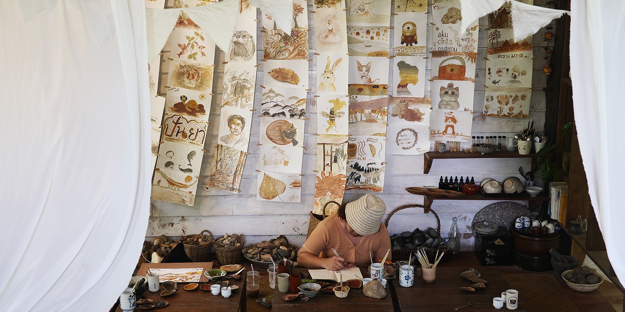 เจ้าของคือ สกาว - สกาวเดือน อินปาน และ จูน - รังสิมา อำภาพร้อม พวกเธอบอกว่ามีเวิร์กช้อปที่ผูกโยงกับวิถีธรรมชาติ เน้นให้ผู้ร่วมกิจกรรมได้พบความสุขจากการลงมือทำ เราเลือก ‘พัทลุงโทน’ เวิร์กช้อปวาดภาพสีน้ำจากหินสีธรรมชาติ ซึ่งต้องเริ่มกันตั้งแต่ออกตามล่าหินสีที่ลำธารกันเลยทีเดียว