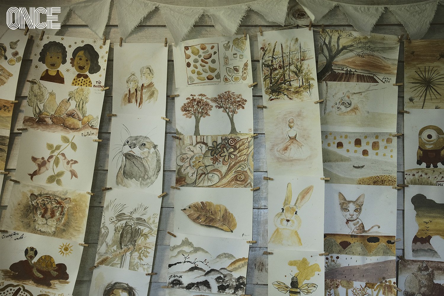 ขึ้นชื่อว่าเป็นคาเฟ่รักษ์โลก อุปกรณ์ที่ใช้ก็ดูคราฟต์ ดู DIY สุดๆ อย่างการหยิบเปลือกฝักสะบ้าลิงที่ใช้เป็นจานสี ใบปอจงที่ให้สัมผัสนุ่มคล้ายผ้ากำมะหยี่ ซึมซับน้ำได้ดีก็นำมาใช้แทนทิชชู่หรือผ้าเช็ดทำความสะอาด เรียกว่าปลอดสารเคมีให้มากที่สุด “อันนี้คือความตั้งใจของเราที่อยากให้คนที่มาหรือเด็กๆ ได้เรียนรู้การใช้วัสดุธรรมชาติรอบตัว ทดแทนการใช้วัสดุอย่างอื่นผ่านการทำกิจกรรมสนุกๆ” สกาวว่าอย่างนั้น ส่วนเราวาดเสร็จก็โชว์ผลงานให้ทั้งคู่ดูสักหน่อย