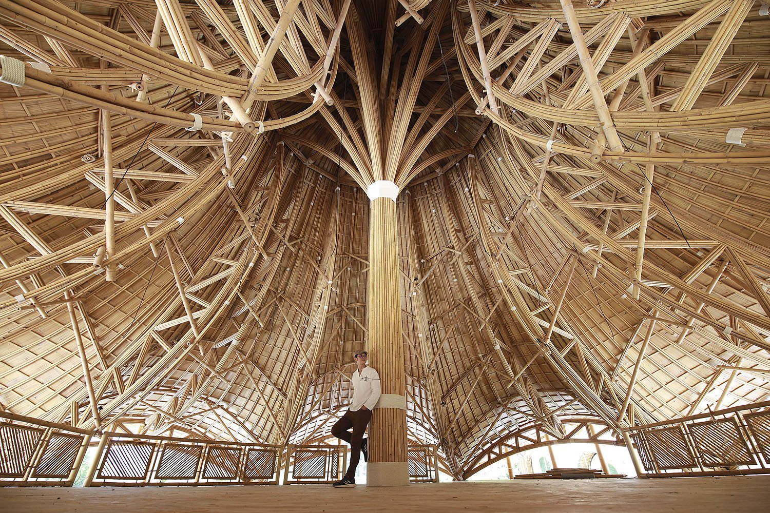 กฤตขอเพิ่มเติมสีของไผ่ที่ถือเป็นจุดเด่นที่เราจะพลาดข้อมูลนี้ไม่ได้ ไผ่หากโดนแดดและฝนไม่นานสีของไผ่จากที่เป็นสีทองก็จะซีดเป็นสีเทา หากนำมาทำเป็นหลังคา “เราเข้าใจปัญหานี้ดีจึงเลือกใช้หลังคาเป็นไวนิลและเอาไผ่แท้เข้าไปอยู่ในอาคารและออกแบบให้โดนแสงน้อยที่สุดเพื่อรักษาสีของไผ่ไว้และไผ่เมื่อไม่โดนแดดฝนจะรักษาสีทองอร่ามไว้ได้และสามารถอยู่ได้เป็น 10 ปี”