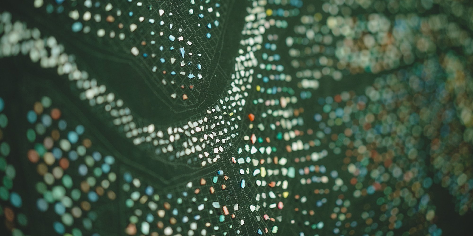 งานศิลปะของผึ้งไม่ได้อาศัยพู่กัน แต่ใช้คีมคีบเศษไมโครพลาสติกแปะลงบนแคนวาสสีดำที่เธอวาดโครงร่างไว้ด้วยดินสอ แปะลงไปทีละชิ้นๆ จนกลายเป็นผังเมืองมุมมองแบบ bird’s-eye view ของชุมชนริมน้ำต่างๆ โดยแหล่งน้ำที่เห็นทำจากเศษไมโครพลาสติกสีขาวเพื่อให้ดูโดดเด่นและแตกต่างจากชุมชนที่ทำจากไมโครพลาสติกหลากหลายสีสัน ที่มองเผินๆ แล้วเหมือนหินสีเล็ก ๆ กลายเป็นผลงานทั้งสวยงามและมีความหมาย