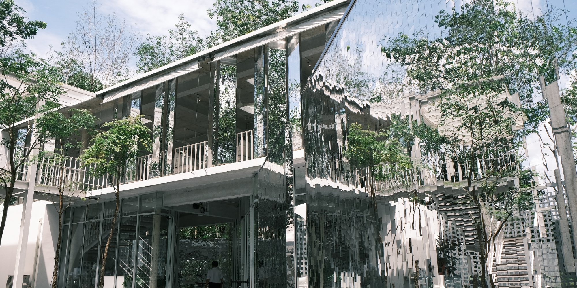 “อาจดูแปลกแยกจากรอบข้าง แต่เรายังอยากสะท้อนความเป็นธรรมชาติเช่นเดิมที่เคยเป็น” มันใช่คำนี้จริงๆ กระจกเงาระยิบระยับ เล่นเงาสะท้อนแสงกับบริบทของพื้นที่รายรอบ สายลมโยกไกว ลมพัดเบาๆ ราวกับต้นไม้เคลื่อนไหวพากันเต้นรำ