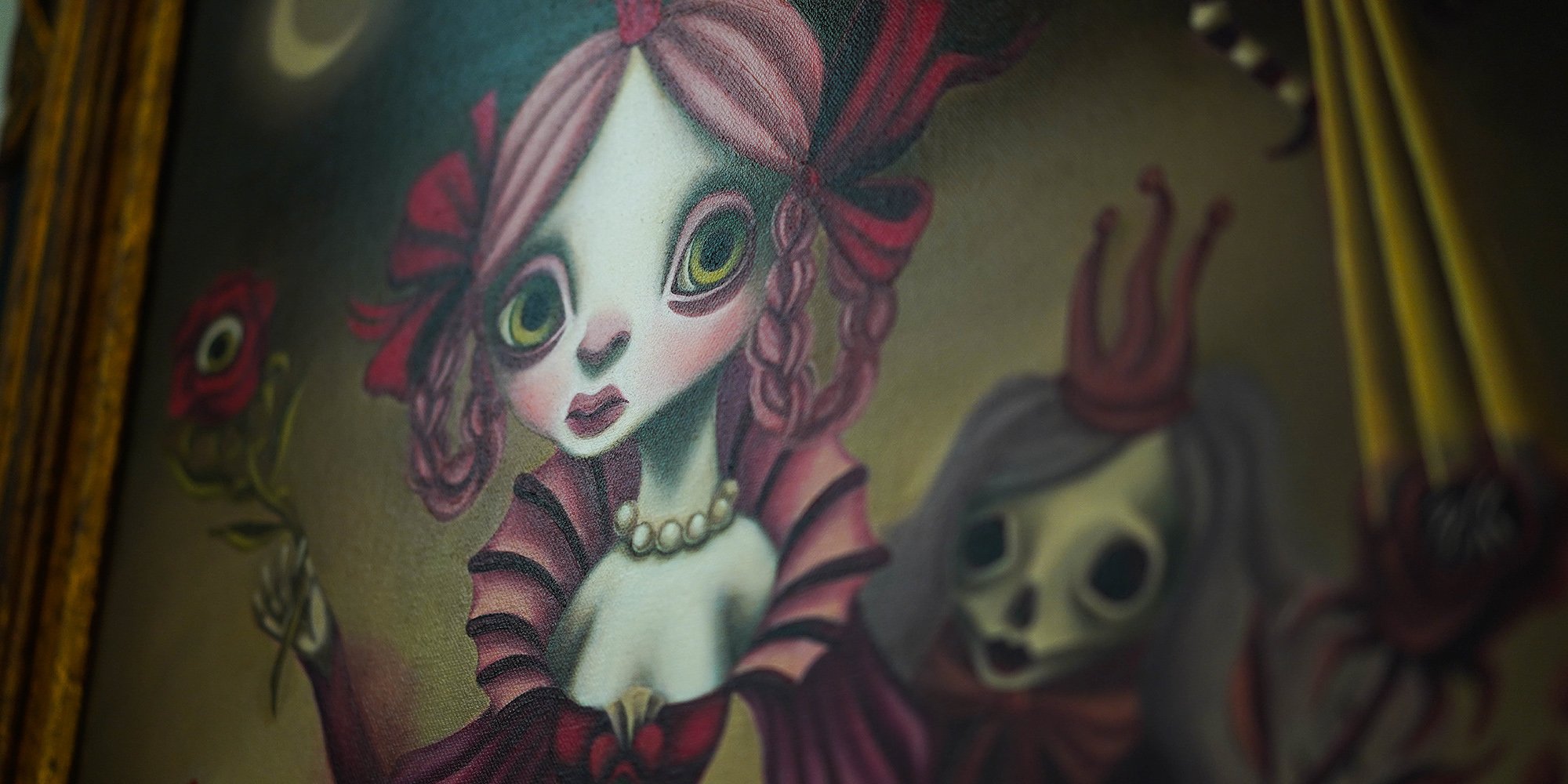 ถ้าชอบเสพหนังดาร์กแฟนตาซี ชอบคณะละครสัตว์ในยุโรปสมัยเก่า คุณจะต้องชอบศิลปะของเพื่อน… วันนี้เราได้เข้ามาในสตูดิโอของเพื่อนที่แม้จะเป็นพื้นที่เล็กๆ มุมหนึ่งของบ้าน แต่เพราะมีภาพวาดสีน้ำมันสุดดาร์ก มีเหล่าตุ๊กตาสุดพิศวง ไพ่ทาโรต์ เชิงเทียน และบรรดาเศษผ้าถูกปักเย็บเป็นรูปหัวใจบ้าง หัวกะโหลกบ้าง กลับกล่อมบรรยากาศที่นี่ให้ดูลึกลับ ราวกับจู่ๆ เราก็หลุดเข้าไปอยู่ในแอนิเมชั่นเรื่อง Coraline เดี๋ยวนั้นเลย