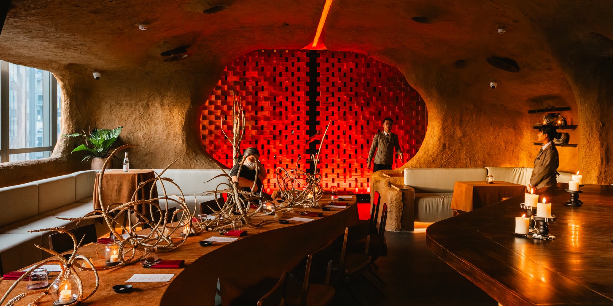 ส่วนบรรยากาศการตกแต่งได้รับแรงบันดาลใจจากถ้ำ ใช้วัสดุจากอิฐดินธรรมชาติ เพื่อสร้างบรรยากาศให้ความรู้สึกอบอุ่น ดิบ เรียบง่าย ขณะที่ด้านบนบางส่วนออกแบบให้เป็นรูปทาโฮนาขนาดใหญ่ เพื่อสื่อถึงการแปรเปลี่ยนอันเป็นหัวใจสำคัญนั่นเอง