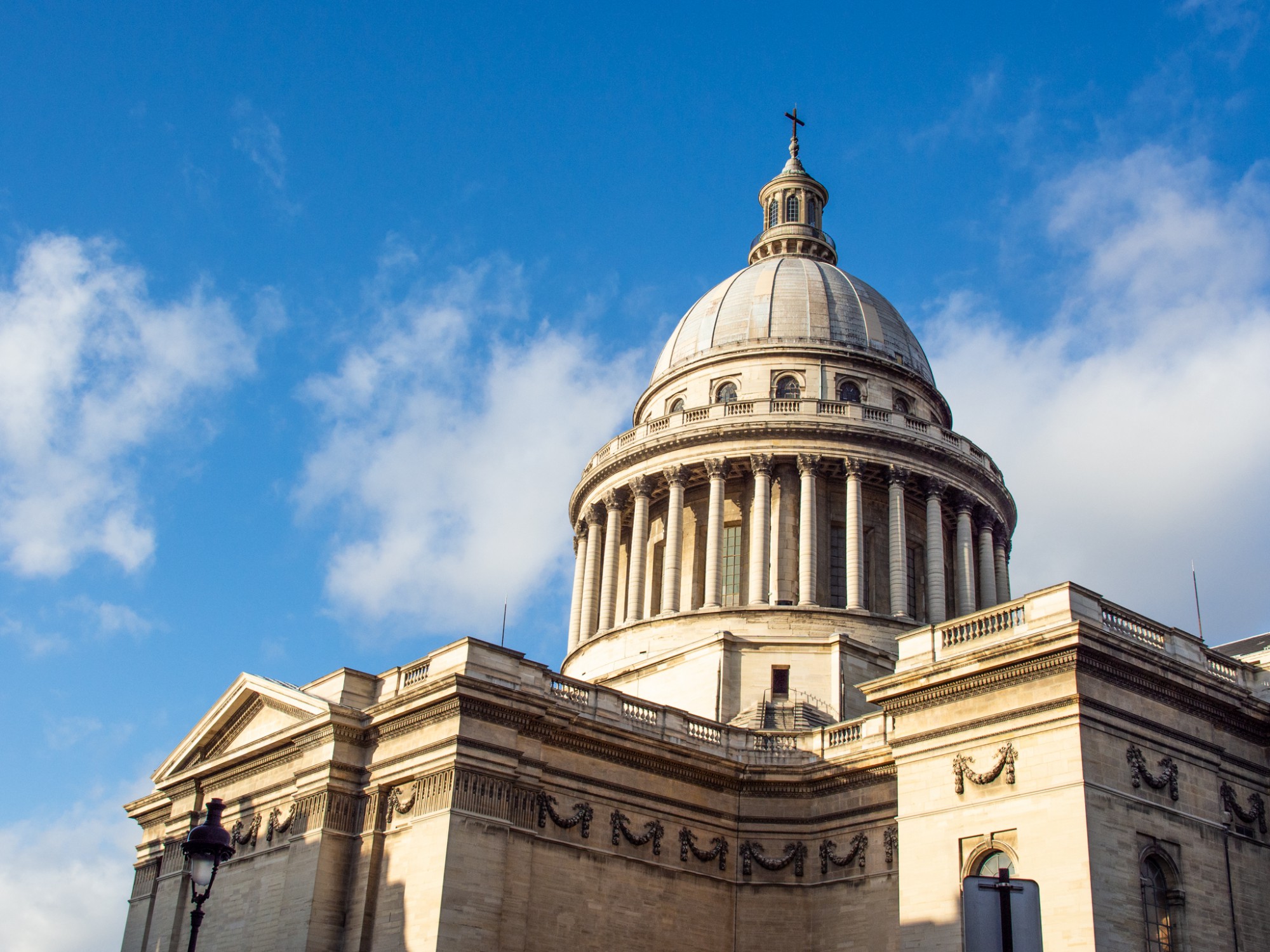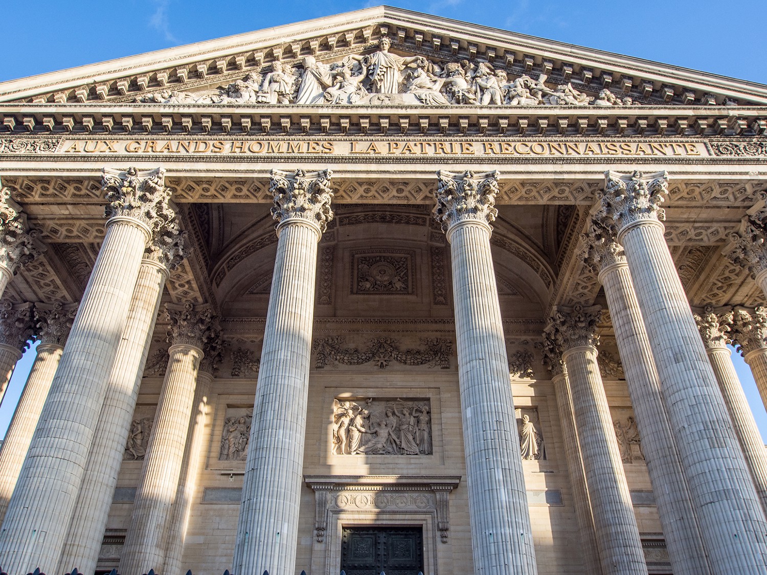 สถานที่แรกเป็นย่านนักศึกษา หรือการ์ทิเย-ลา-แตง (Quartier latin) ในใจกลางกรุงปารีส บนเนินเขานักบุญ เฌอ-เนอ-วิ-แอฟ (Sainte-Geneviève) ทางฝั่งซ้ายของแม่น้ำแซน (หรือที่ชาวปารีเซียงเรียกกันว่า Rive gauche) เมื่อเดินขึ้นมาถึงยอดเขาจะพบกับวิหารป็อง-เต-อง (le Panthéon แปลว่า วิหารแห่งเทพ) ที่สร้างขึ้นเมื่อคริสต์ศตวรรษที่ 18 เพื่ออุทิศให้นักบุญผู้นี้ แต่หลังการปฏิวัติฝรั่งเศส ที่นี่กลายเป็นสถานที่ฝังศพบุคคลสำคัญของฝรั่งเศส อาทิ Jean-Jacques Rousseau (ผู้ประพันธ์ “ว่าด้วยสัญญาประชาคม” – Du Contrat Social) / Victor Hugo (ผู้ประพันธ์ Notre-Dame de Paris และ Les Misérables)/ Louis Braille (ผู้คิดค้นอักษรเบรล) / คู่สามีภรรยานักวิทยาศาสตร์ Pierre และ Marie Curie เป็นต้น เพื่อยกย่องคุณงามความดีที่ทำไว้ในด้านต่างๆ ดั่งที่ปรากฏข้อความ ‘Aux grands hommes la patrie reconnaissante’ (แด่มหาบุรุษ ด้วยกตัญญูของมาตุภูมิ) ที่จารึกไว้ด้านบนของทางเข้า