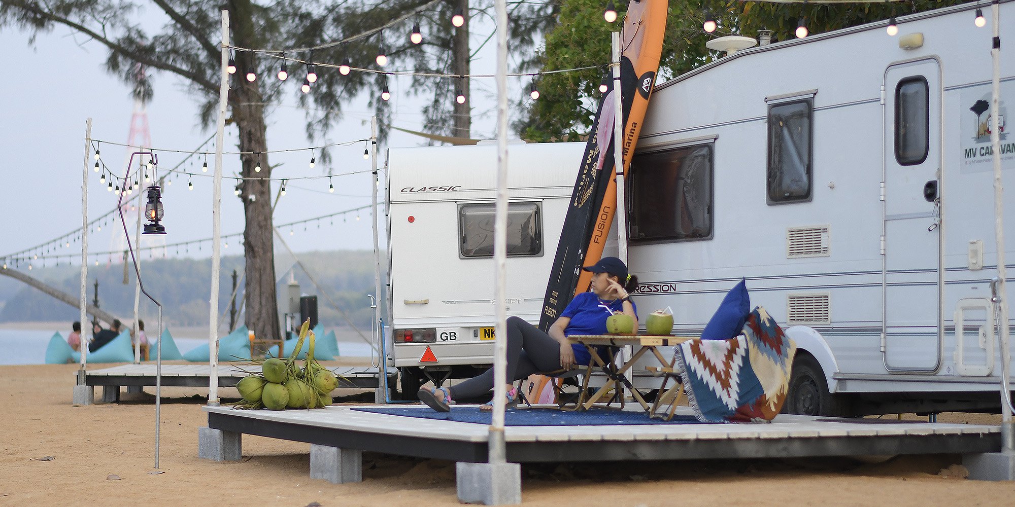 “สมัยไปเรียนอยู่ชิคาโกมีโอกาสได้ไปแคมป์สไตล์รถบ้านอยู่บ่อยๆ แล้วรู้สึกสนุกชอบมาก และบรรยากาศที่นี่ก็เหมือนอยู่ริมเลกมากกว่าทะเลเพราะเป็นทะเลใน ให้อารมณ์เหมือนตอนอยู่ต่างประเทศ จึงลงเอยที่ Caravan” (MV Caravan) อดีตดีไซเนอร์ผ้าทอของมูลนิธิฯแม่ฟ้าหลวง เล่าถึงแรงบันดาลใจ