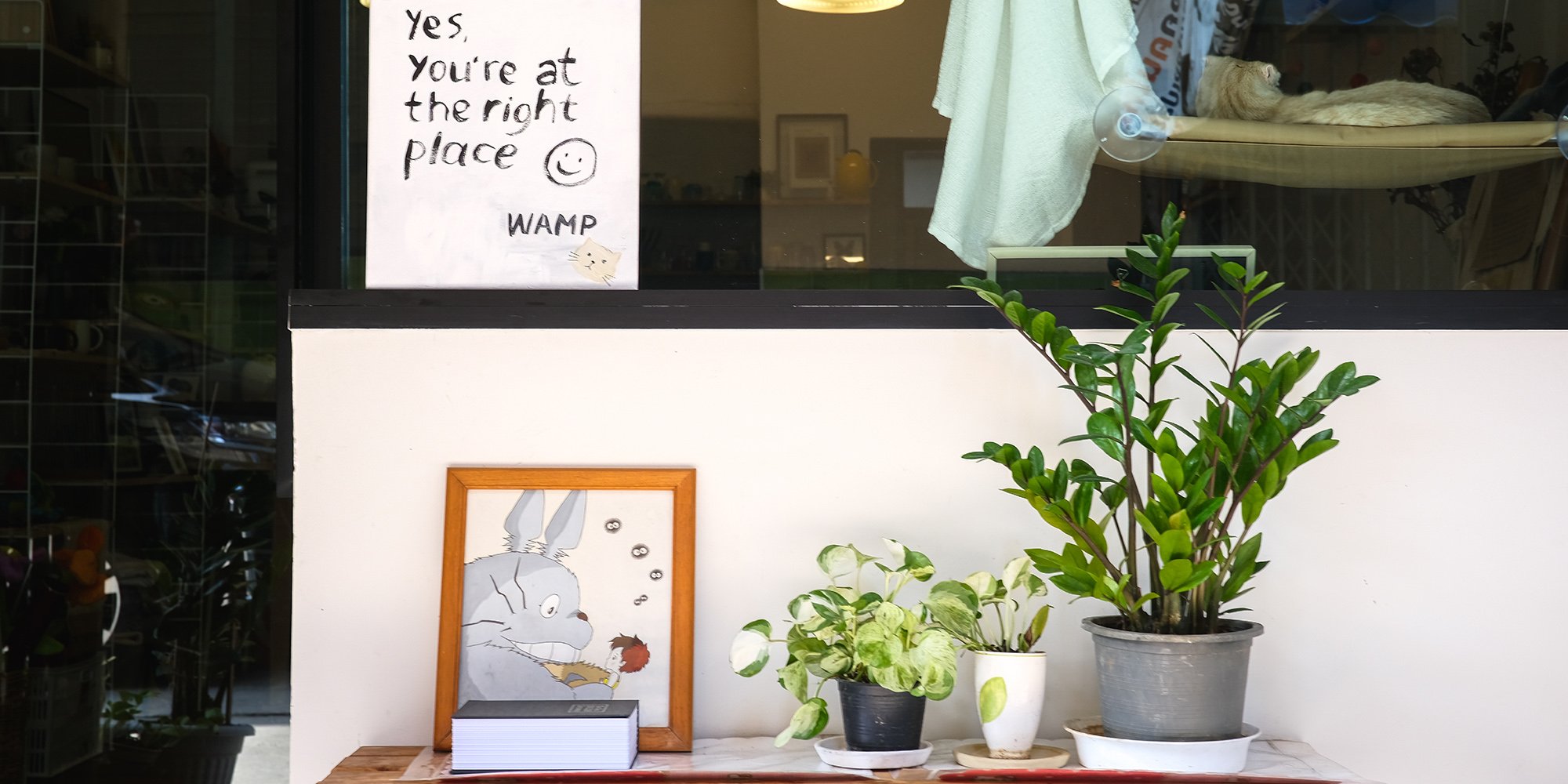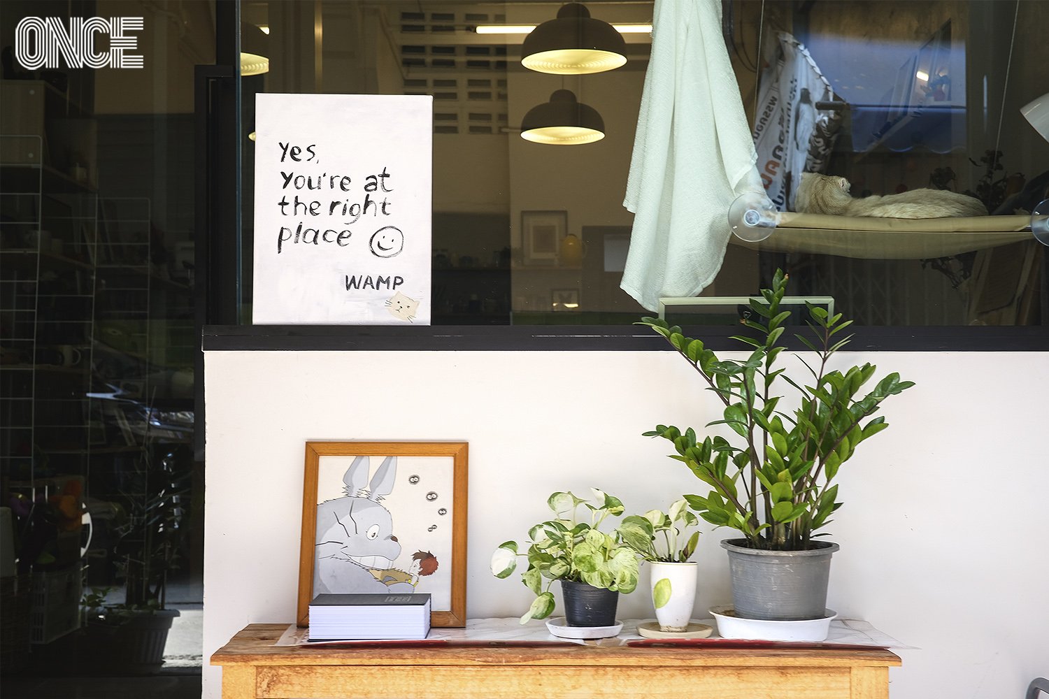 Wamp Co. ตึกแถวขนาด 1 คูหา ความกว้างกำลังพอดีสำหรับการพบปะ 8-10 คน ที่นี่ให้ความรู้สึกสบาย เงียบสงบมีเพียงกลิ่นหอมกาแฟ เสียงดนตรีจังหวะเบาสบาย มีเสียง Ambient ของการทำเวิร์กช้อปและอาจมีเสียงพูดคุยเล็กน้อยที่คอยอยู่เป็นเพื่อนระหว่างที่คุณทำกิจกรรมอะไรก็ตามภายในพื้นที่นี้